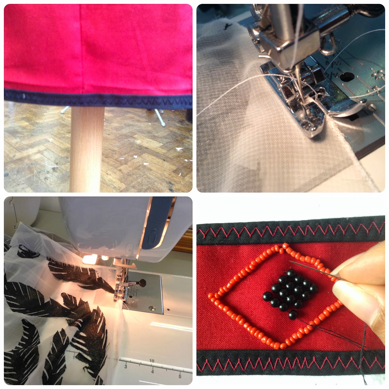 I had intended to end up with three garments inspired by my native american research and that is what I have ended up with. I went back to the British Museum and drew more pictures of artifacts, this time more in depth looking at the shapes and textures of these objects. The last time I went my drawings were very sketchy and quick but over the time of the course I have learnt to give myself more time when it comes to drawing so they end up successful. I wanted to create three garments with a range of textile techniques to embellish them and it is evident that I have done that in what I have produced. I am very pleased that within a few weeks I have created not just one but three successful garments. I faced some technical difficulty when creating the garments but I managed to work out the problems and get them fixed. Some of the dresses were changed slightly so I could end up with a better outcome. I am please with the small collection I have created, I think Its clear to see the inspiration behind the three pieces through the patterns and colours I used. The three dresses were simple in shape and decorative in embellishment and that choice was inspired from the fact that the native Americans would have simple garments but were decorated with beads or embroidery like my collection. I started off by designing my own pattern pieces, I really wanted a princess bodice style dress to make it fit nicer on the body. One of my dresses involved me cutting up strips of fabric and then attaching them onto the fabric using bondaweb, although this process took some time the ending result was beautiful. I love how because of it being handled, the strips of fabric would fray a bit giving it that rustic look which really added to the feel of the dress. One problem I faced when making this dress was the fabric pieces becoming stiff because of the layers of fabric which altered the shape of the dress. However it wasn't nothing a couldn't of darts couldn't fix. Another part of embellishing this dress was the printing which involved me cutting out several templates from freezer paper and then ironing them on and printing over them using fabric paint. Despite the time it look the colours of the strips worked well with the black native inspired printed design. Both techniques worked well together so for that reason I wouldn't change it. To give the dress that finished look rather than adding lining to stiffen it even more I added bias tape to the top and bottom of the dress. Overall I love how this dress turned out, there were times where I thought It wouldn't work but I'm glad that everything did eventually work. I had designed one of my dresses to be full length but I wasn't confident in making it without having my model there so test out the length so I changed it to be short at the front and long at the back so it wouldn't matter as such. Again I made my own pattern pieces to make this dress. To make the shape a bit more dramatic I made the back piece quite long and a bit wider to give the dress more movement and volume when it moves on the catwalk. This dress also took quite some time to make because I was using the technique of melting plastic onto fabric. During my research and experimenting stage I decided to look at feathers, rather than just using feathers I looked at how I could create my own. I was then shown the process of melting plastic onto fabric using a heat press, this technique was something new and something that looked lovely. This meant I had to cut out a load of feather shapes out of plastic to then heat press them on my fabric. It was a fiddly process but it looks really nice on the chiffon. However I soon realized the more I moved and fabric to sew it up the plastic feathers were peeling off. There was nothing more I could do but keep ironing them down which was a little frustrating. If I were to remake this dress I would have to use another method of printing so the feather shapes stayed on the chiffon. Despite the issue of the plastic not working too well on the chiffon It did look lovely, especially when the model walked down in it. Because the dress was see through I made a simple bodycon dress to go underneath it. The third dress I made was inspired by the native american headdress, taking the element of the band and feathers. I used the same princess bodice pattern to make my third dress but taking out some seam allowance because the first time the dress was a bit big. The embellishment for this dress was just in the band and feathers that were going to go on the skirt. The waist band included beading, applique and embroidery which ended up looking beautiful. To make the band look neat I made my own bias tape and sewed it along the edge of the top and bottom. I am very please with how the waist band turned out with the different shapes and colours complimenting each component. The next part of embellishment for this dress was the feathers that were going to go down the skirt however upon placing them on top of the dress I realized it made the dress look cheap and tacky. I really wanted to incorporate the feathers on the dress because it was inspired by the native american headdress so I played around with the positioning of them. In the end I positioned the feathers on the top and at the bottom edge of the waistband. This made the waistband look even more nicer and gave the dress a drawing point for the eyes to look at. The black and red colour scheme of this dress just looked very beautiful and classy. I think the outcome of this dress was alot better than the original design. All the elements of this dress worked well together, just like the other two dresses I made. There are a couple of changed I would make to the one dress if I were to redo it but apart from that I am pleased with the garments I have produced withing a couple of weeks.